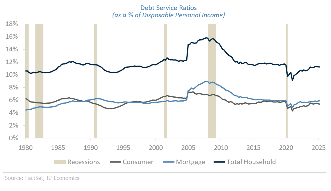 Although the stability of the consumer depends on its ability to generate labor income, i.e., wages and salaries, households’ financial conditions are very important in supporting the stability of consumption. If we look at household debt service payments as a percentage of disposable personal income in the graph below, we see a pattern similar to that during the recovery from the pandemic recession, as this debt service ratio has remained relatively low. Even the large increase in mortgage rates has not been an important source of stress in households’ financial conditions, as borrowing has remained limited.