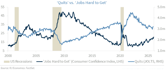 The next two series shown in the chart below - a subset of the Consumer Confidence Index produced by The Conference Board, a qualitative survey, and Quits, a quantitative series produced by the Bureau of Labor Statistics - tend to confirm that what American consumers are feeling can be explained outside of consumption metrics.