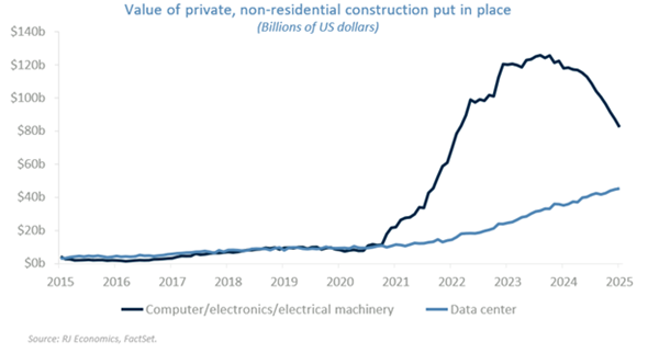 For the first time since 2023, the US economy appears to be gaining momentum across sectors. The manufacturing sector in particular has shown signs of life, posting two consecutive expansionary readings in the ISM Manufacturing PMI. While many observers credit the AI boom, the underlying driver is more structural: the CHIPS Act and the Inflation Reduction Act, which triggered a surge in manufacturing construction starting in 2021. These investments are now coming online. More recently, data center construction – boosted by AI-related demand – has added further momentum.